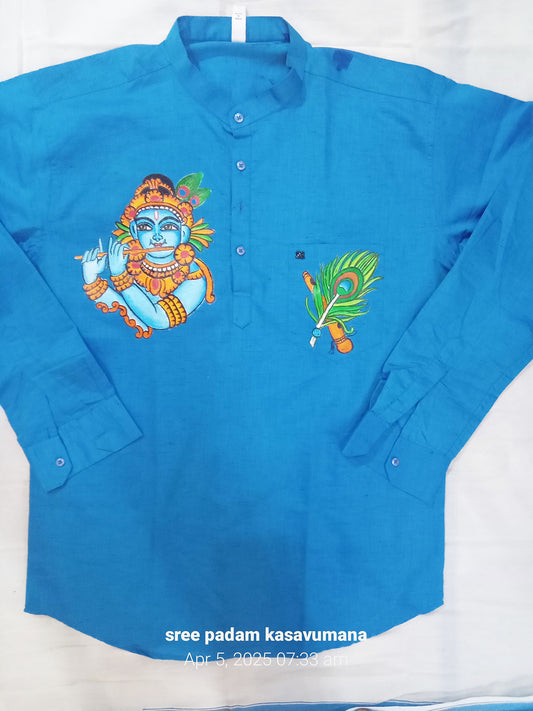 krishna peeli mural hand painting on blue shirt with lotus silk mundu