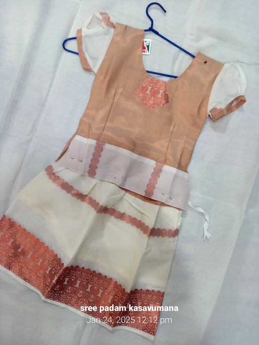 Line design kerala tissue kids pattu pavads with kalamkari border and blouse