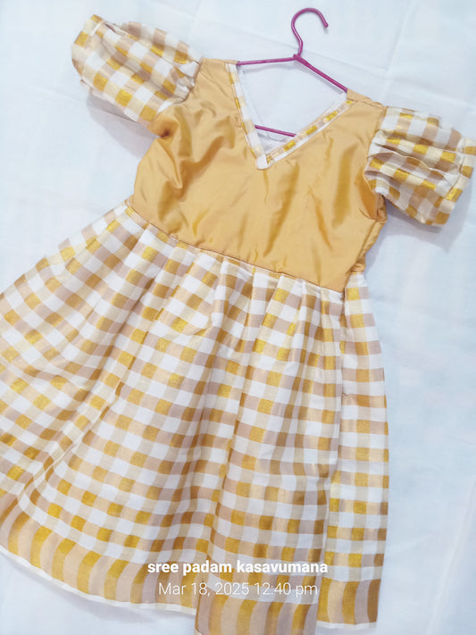 Butterfly design hand mural painting on kerala tissue kasavu frock for kids