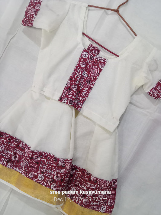 Red Kalamkari design kerala kasavu cotton pattu pavada for kids