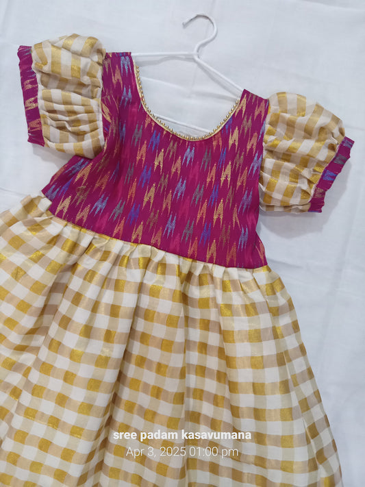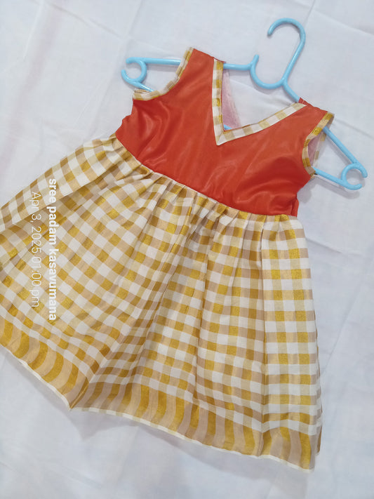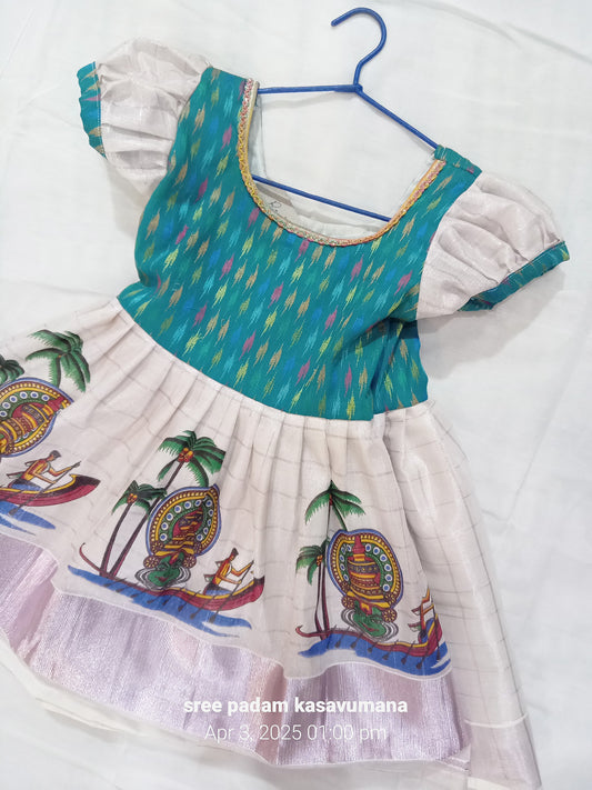 Designer copper tissue kathakali with boat design kerala frock for kids