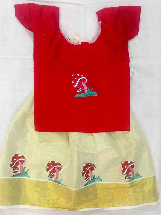 Designer hand mural painting mushroom design pattu pavada with red blouse for kids