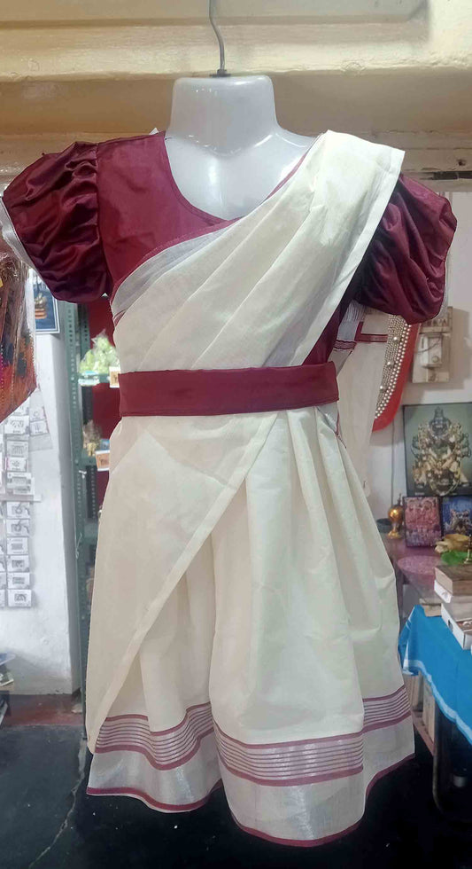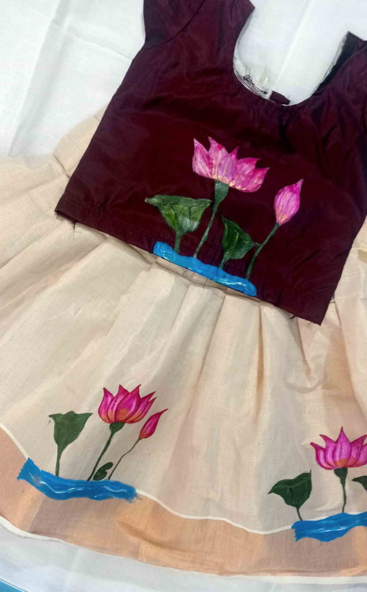 Designer hand mural painting lotus design tissue pattu pavada with maroon blouse for kids