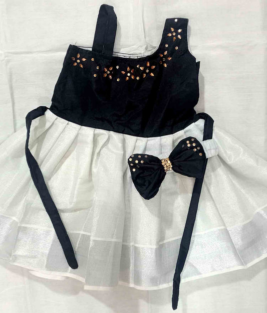 Black hand work designer kerala silver tissue girls frock with hair band for kids