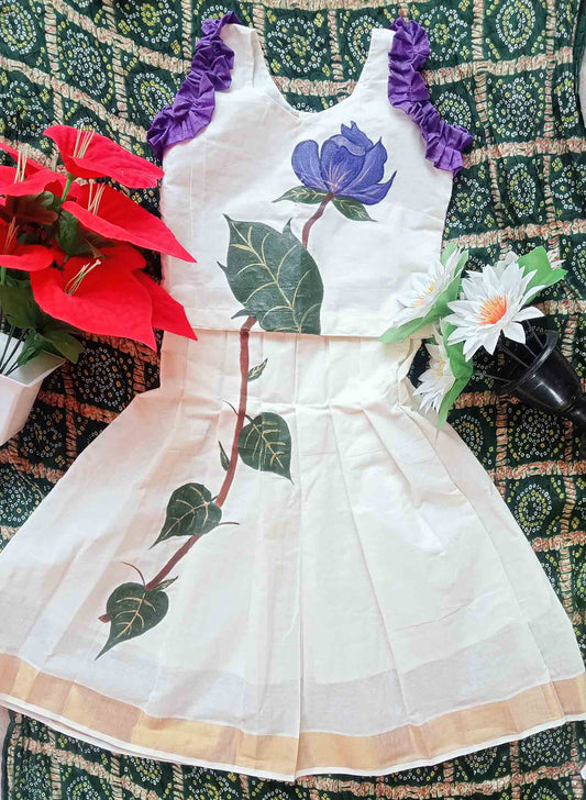 Blue flower and leaf designer hand mural painting kerala pattu pavada for kids