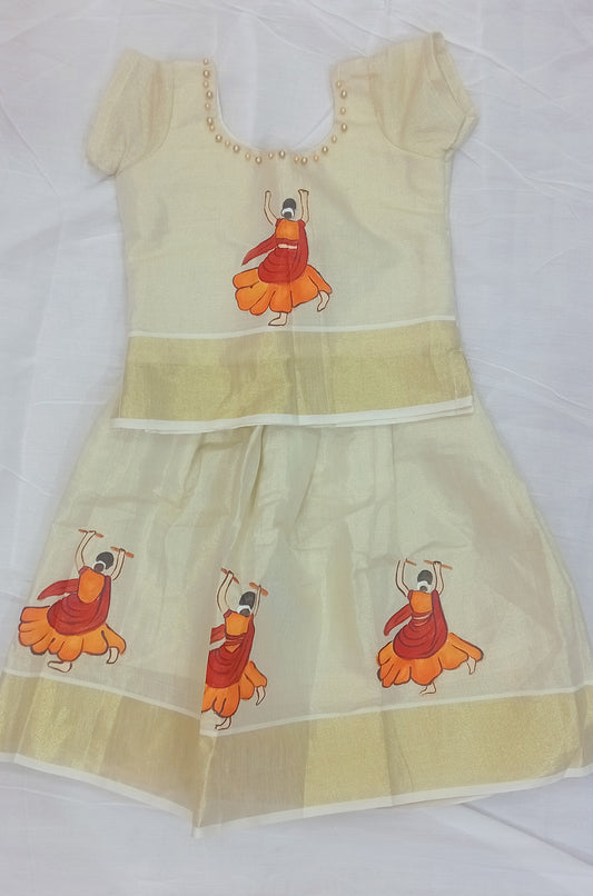 Blue Kalamkari design kerala kasavu cotton pattu pavada for kids