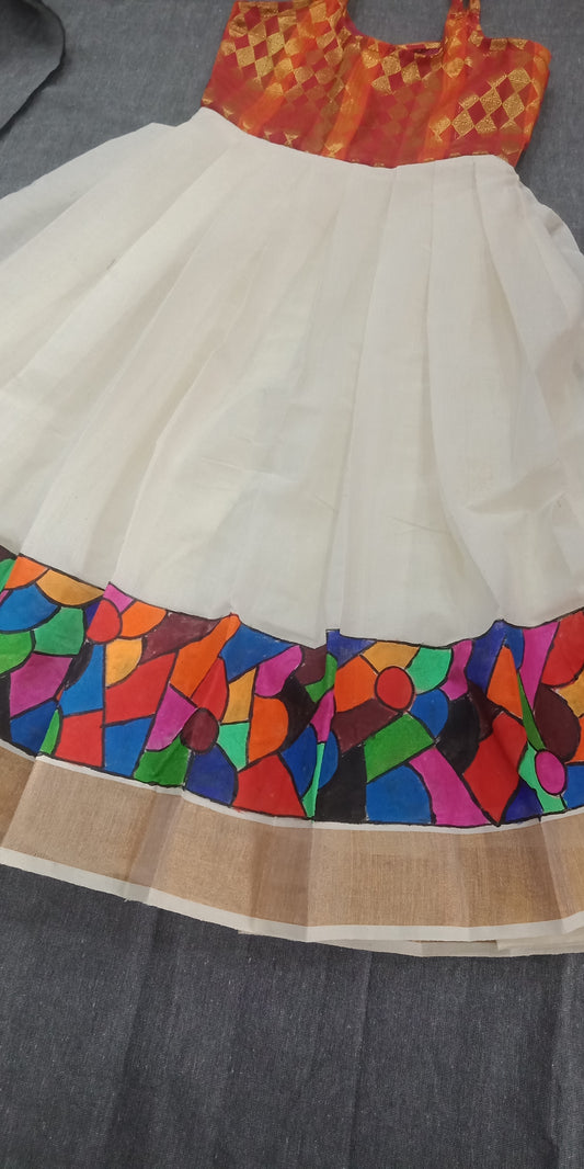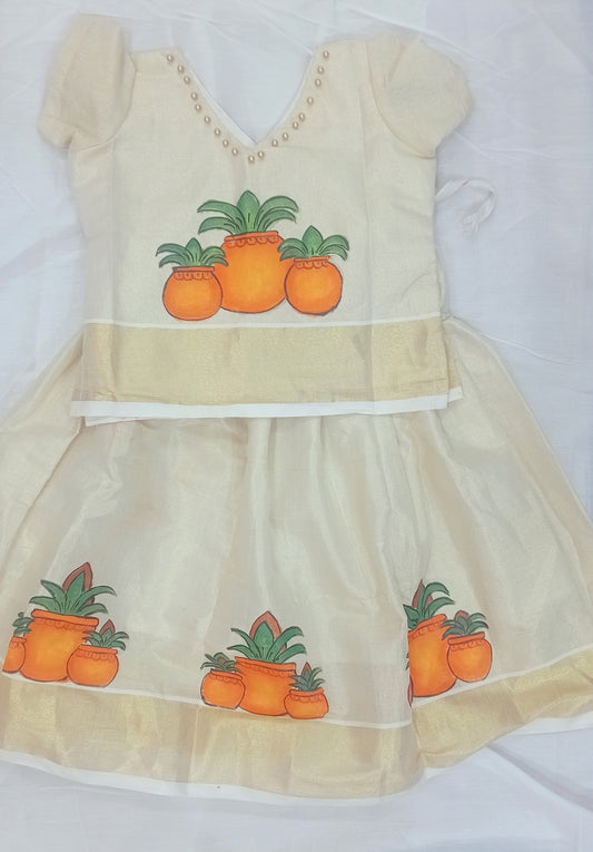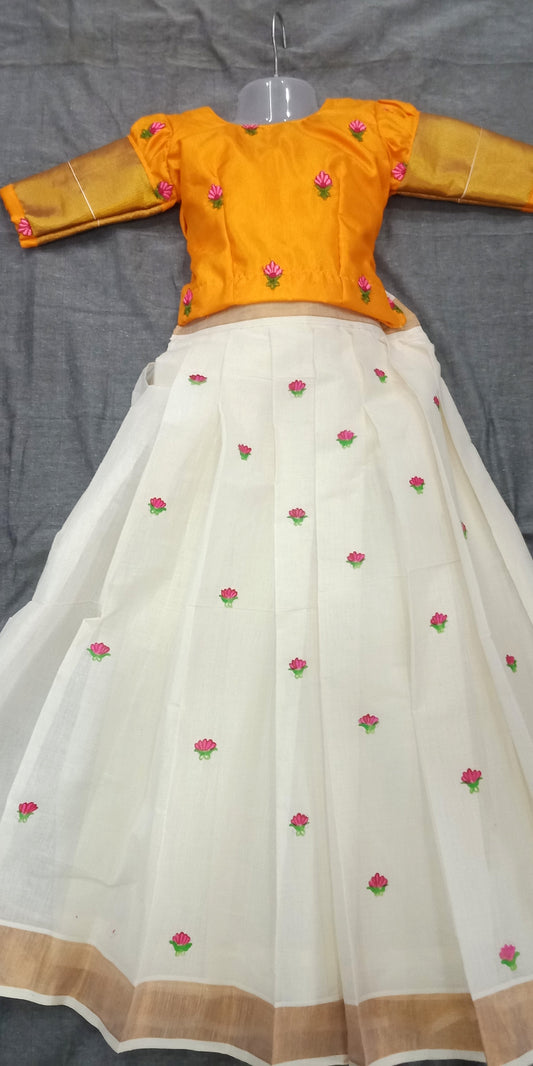 Designer flower embroidery top kerala onam pattu pavada with flower hand painting