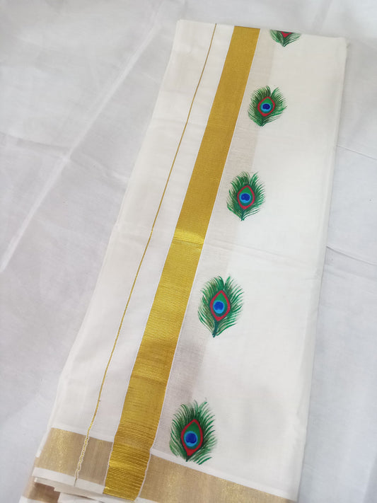 Green shade mazhilpeeli hand mural painting on kasavu mundu