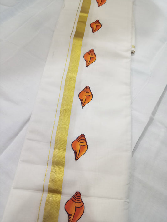 Sangu design hand mural painting on kasavu mundu