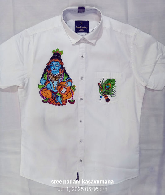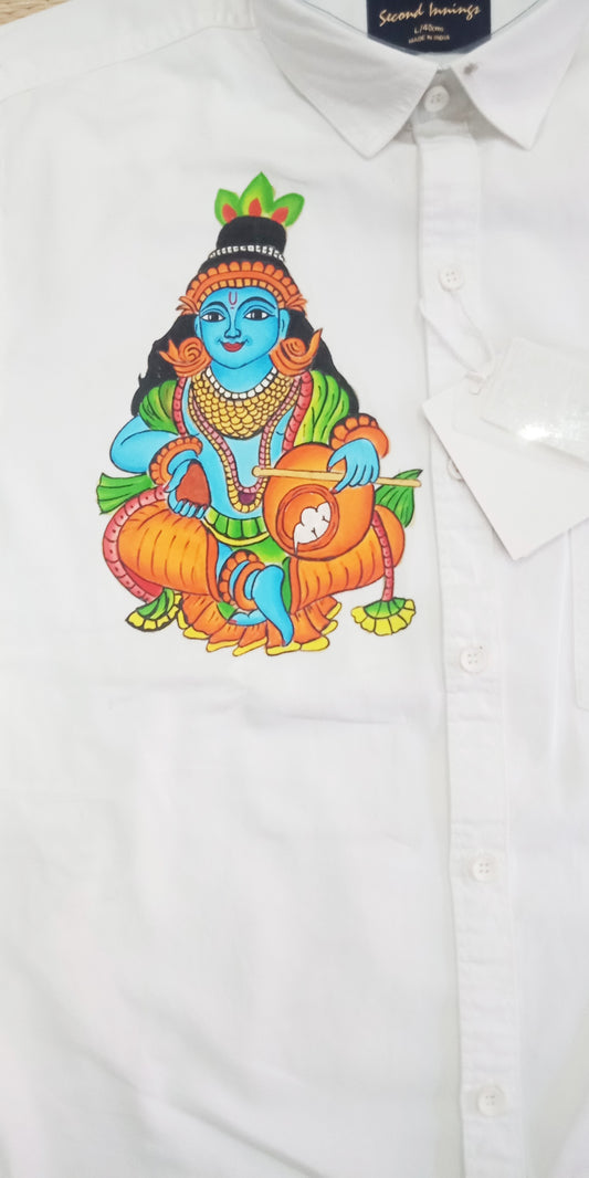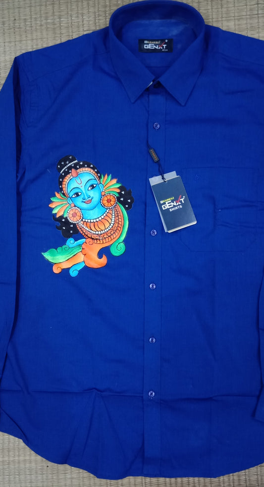 Blue face krishna hand mural painting on white cotton shirt with peeli mundu