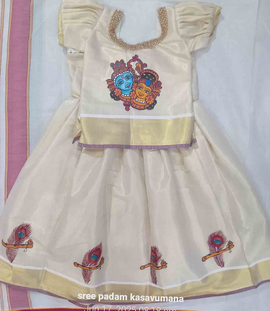 Radha krishna hand mural painting with peeli design kerala tissue pattu pavada for kids