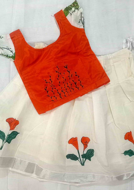 Flower design hand mural painting kerala pattu pavada with orange blouse for kids