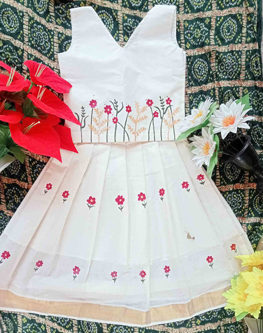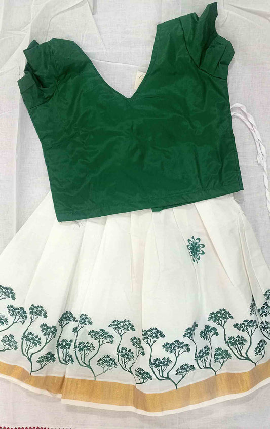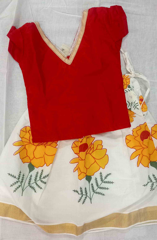 Flower print design kerala kasavu pattu pavada with red blouse for kids