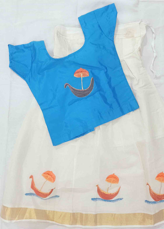 Hand mural painting boat design kerala kasavu pattu pavada for kids