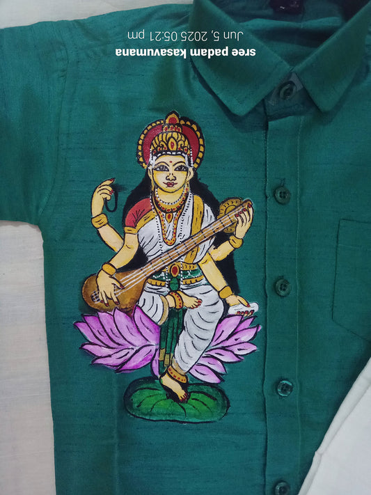 Saraswathi devi hand mural painting on green silk shirt with mundu for kidsRegular price From Rs. 1,770.00Regular priceUnit price / per-