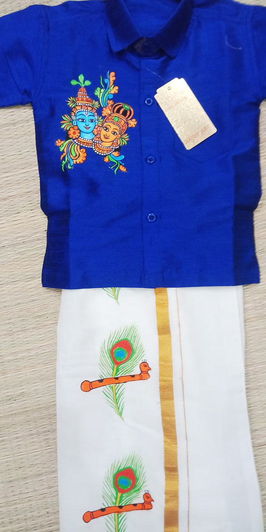 Krishna with peeli hand mural painting on blue kids shirt with peeli munduRegular price From Rs. 1,520.00Regular priceUnit price / per-