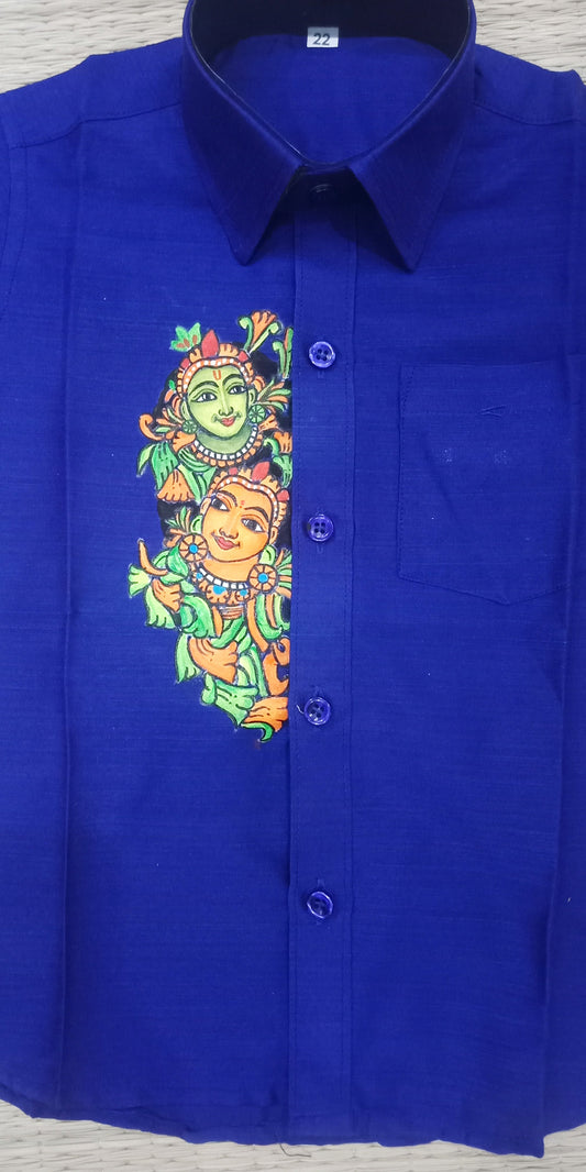 Krishna Radha hand mural painting on blue kid shirt and peeli mundu