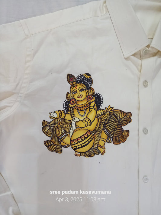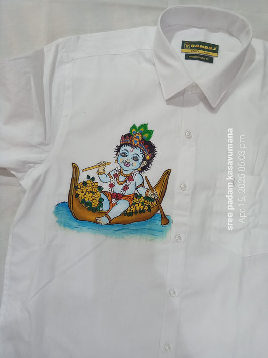 Cute Krishna with boat design hand mural painting on white cotton shirt
