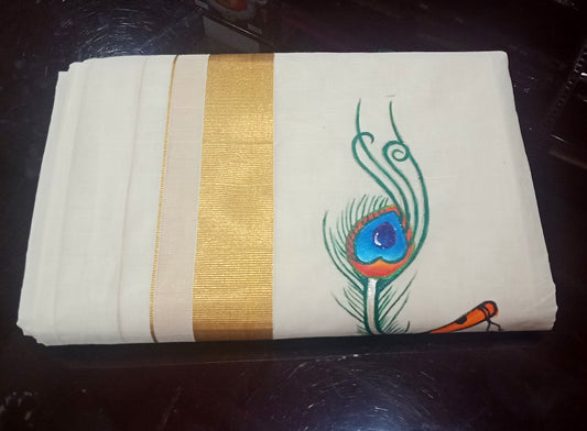 Stylish mazhil peeli hand mural painting on kasavu mundu - 4 meter