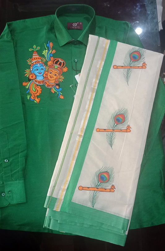 Green Krishna Radha hand mural painting on blue silk shirt with peeli mundu