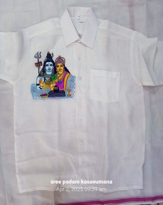 Cute ShivaParvathi design hand mural painting on white cotton shirt