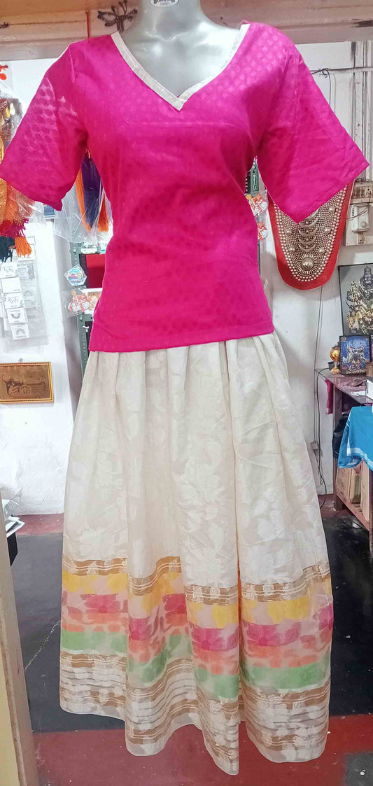 Designer colourful kerala kasavu pattu pavada with magenta blouse for women