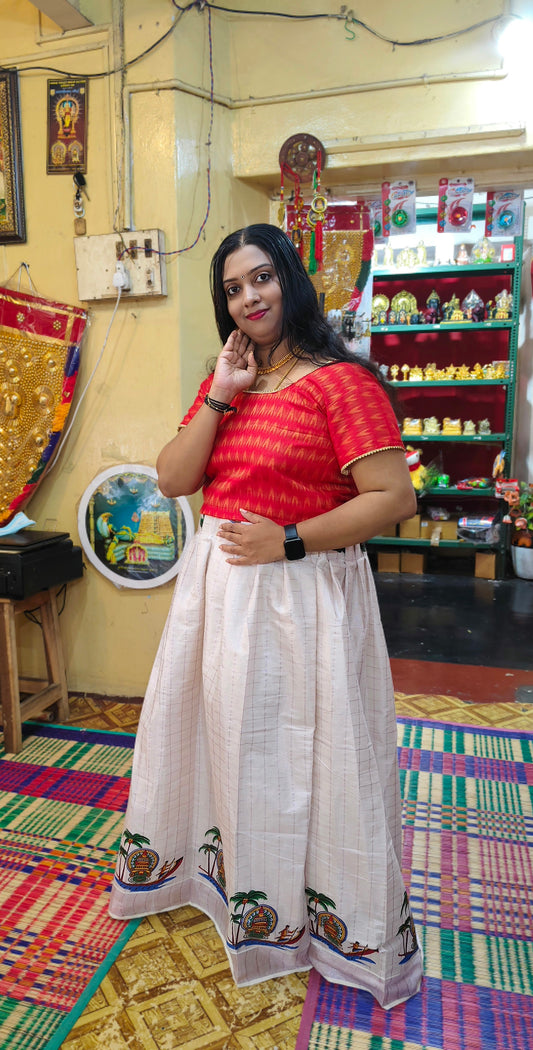 Red flower kerala tissue kasavu pattu pavada with red blouse for women