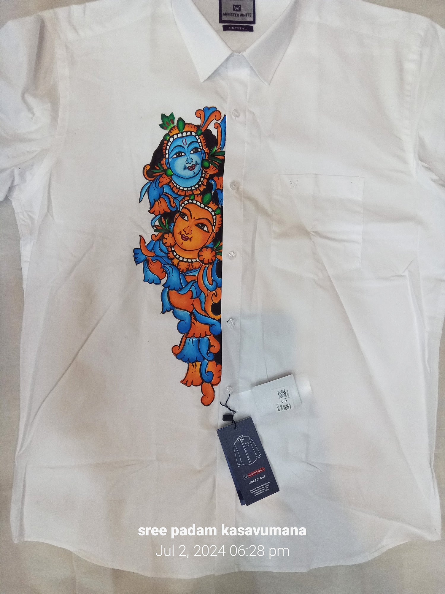 Experience the beauty of Indian art with our Blue Krishna with Radha hand mural painting on a white shirt. Expertly crafted and available at the lowest rates, this shirt is a must-have for any art enthusiast. Add a touch of cultural elegance to your wardrobe today. Krishna radha hand mural painting on white shirt at lowest rate in trivandrum.