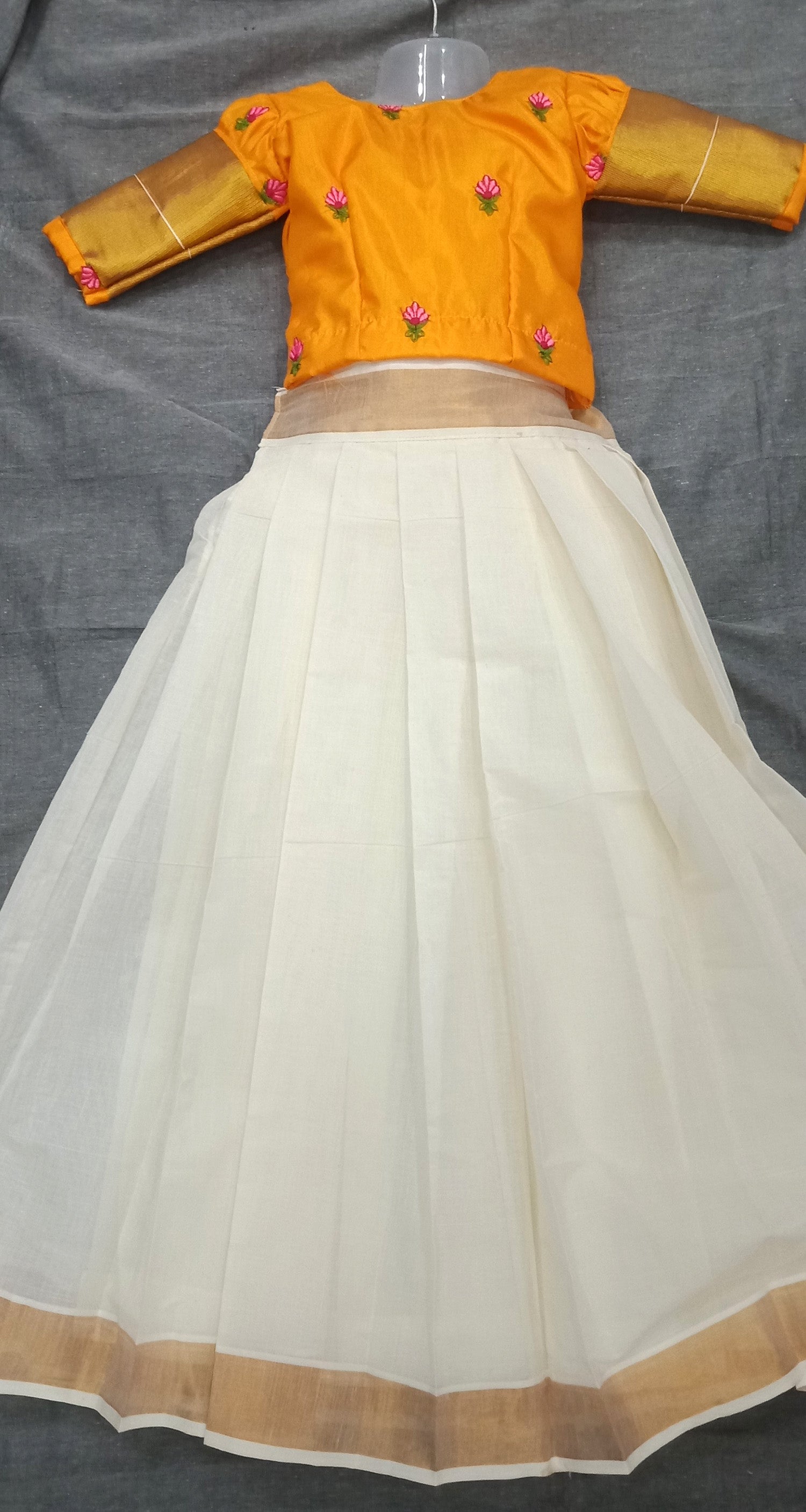 Designer flower embroidery top with kerala cotton pavada - kerala Onam style pattu pavada. Onam collections kerala pattu pavada online shopping.