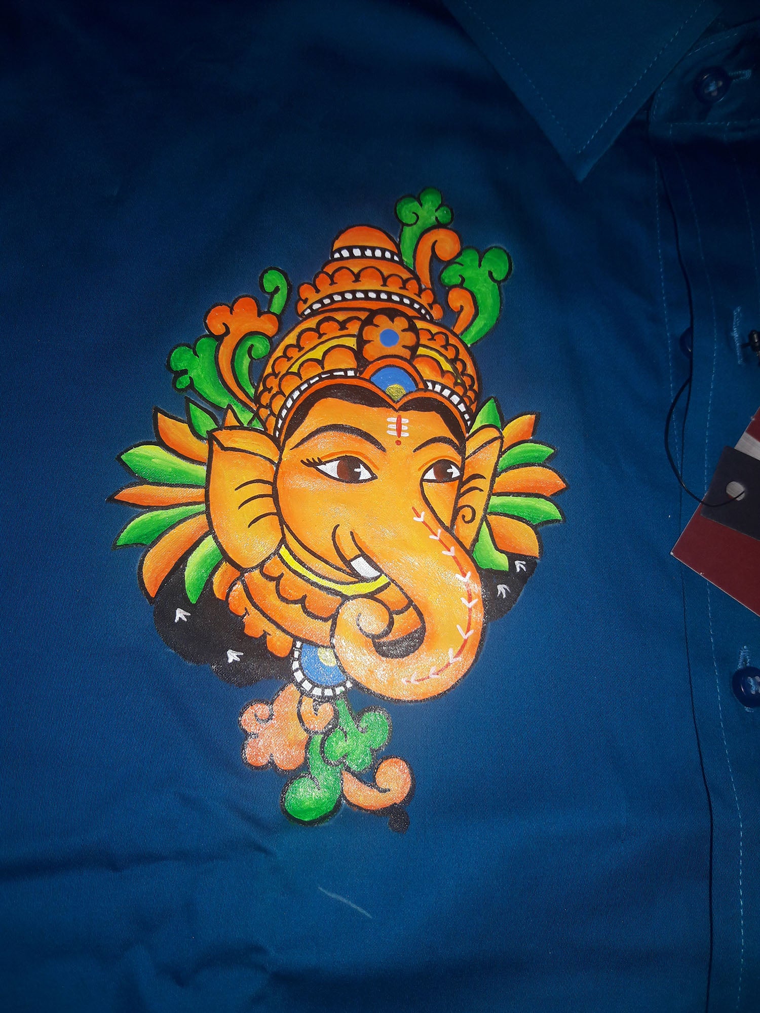 Ganapathi hand mural painting on blue cotton shirt. Top hand mural painting Ganapathi design on shirt online shopping site.