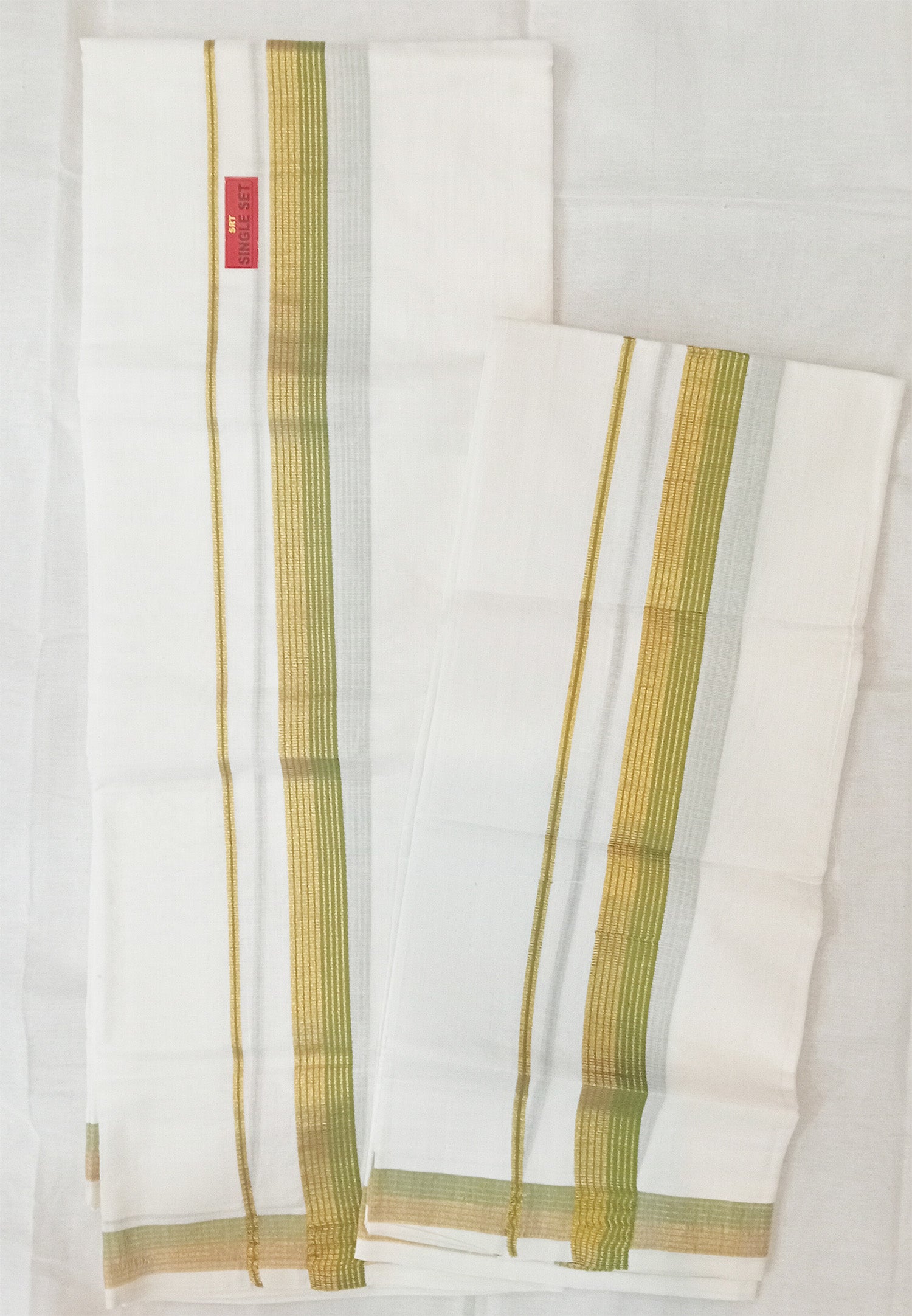 Introducing our elegant Green Kara Kerala Kasavu Single Setmundu for women. Made from the finest quality materials, this setmundu features traditional Kasavu detailing and comes in a beautiful shade of green. With our competitive rates, you can now own a piece of Kerala's cultural heritage at an affordable price.