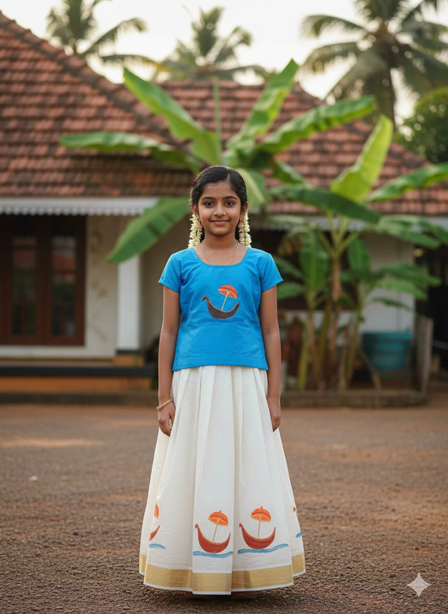 Hand mural painting boat design kerala kasavu pattu pavada for kids