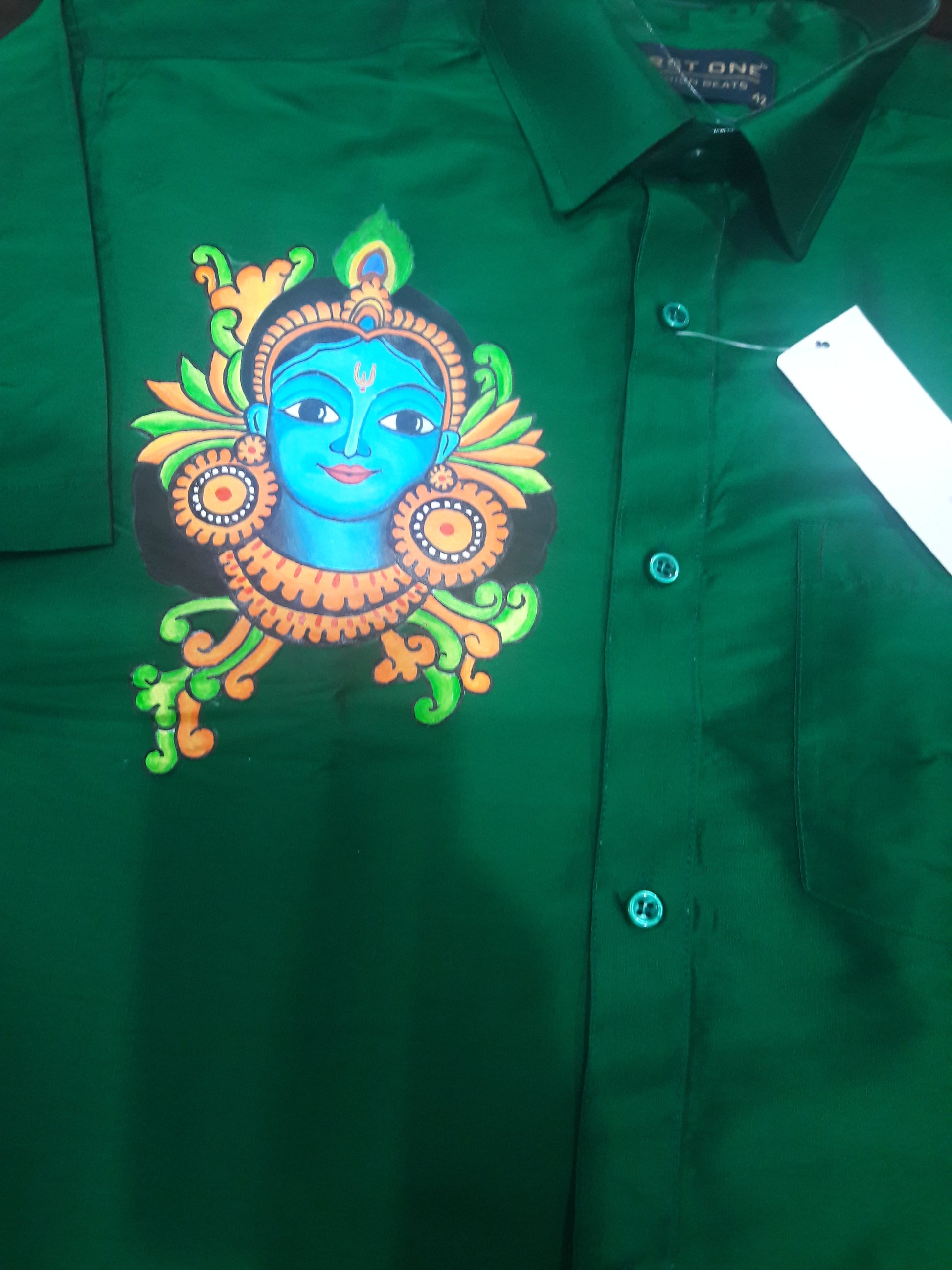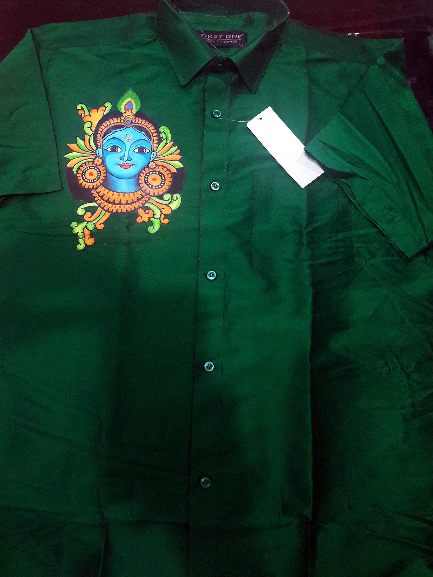 Krishna face hand mural painting on green silk shirt. Trivandrum top krishna hand mural painting on silk shirt online shopping site.