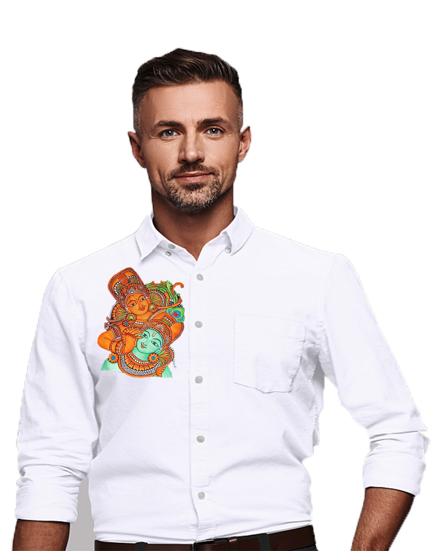 Krishna Radha combination hand mural painting on white cotton shirt. Kerala top hand mural painting krishna radha design online shopping site.