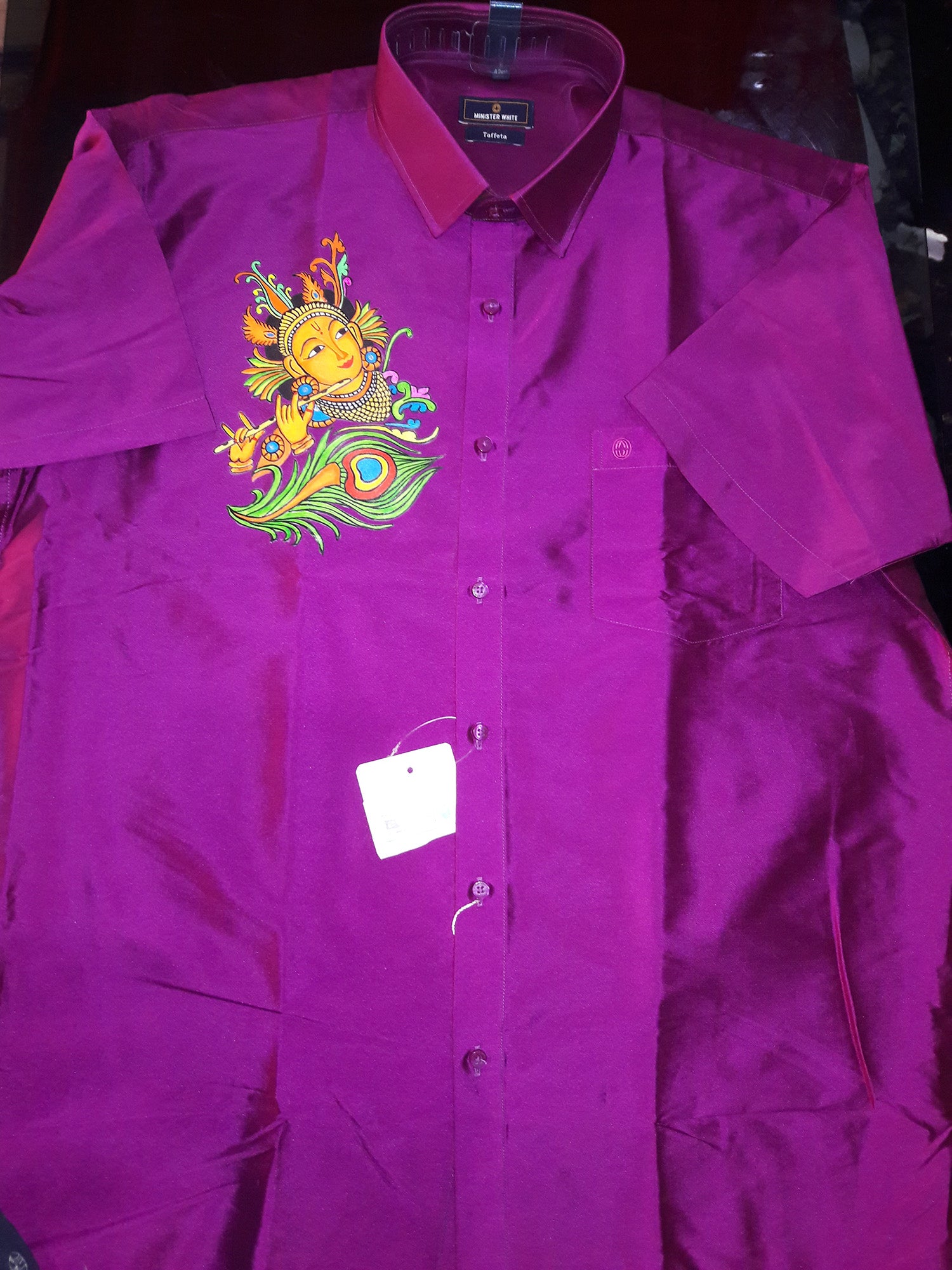 Experience traditional design in modern style with our Krishna with peeli flute hand mural painting on maroon silk shirt. This high-quality shirt features a hand-painted mural of Krishna with his iconic peeli flute. The mural is painted on a luxurious maroon silk background, making it perfect for any formal occasion.