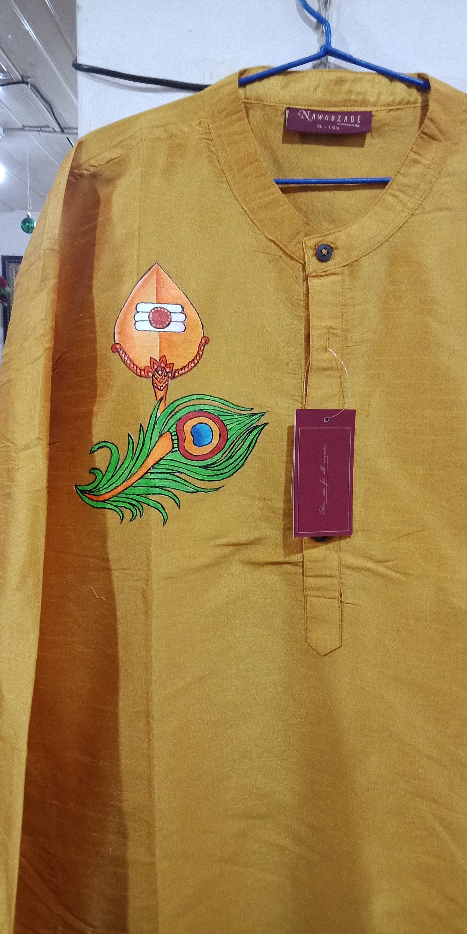 Lord Muruga Vel hand mural painting on silk yellow kurta. Trivandrum top hand mural painting muruga design on kurta online shopping.