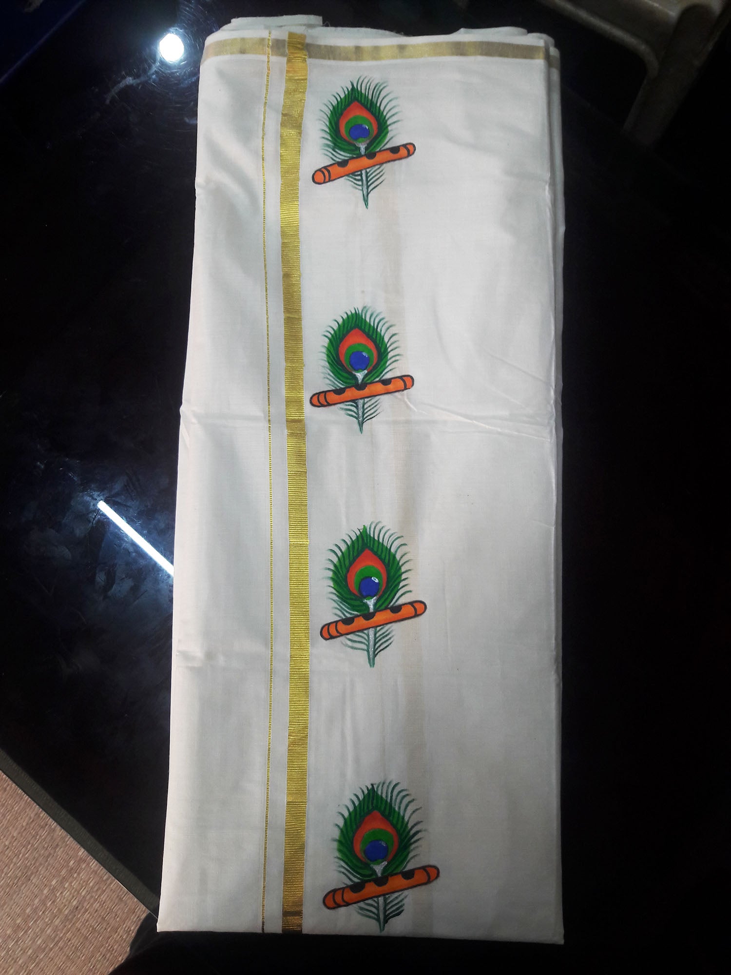 mazhilpeeli with flute hand mural painting kasavu mundu - 4mtr