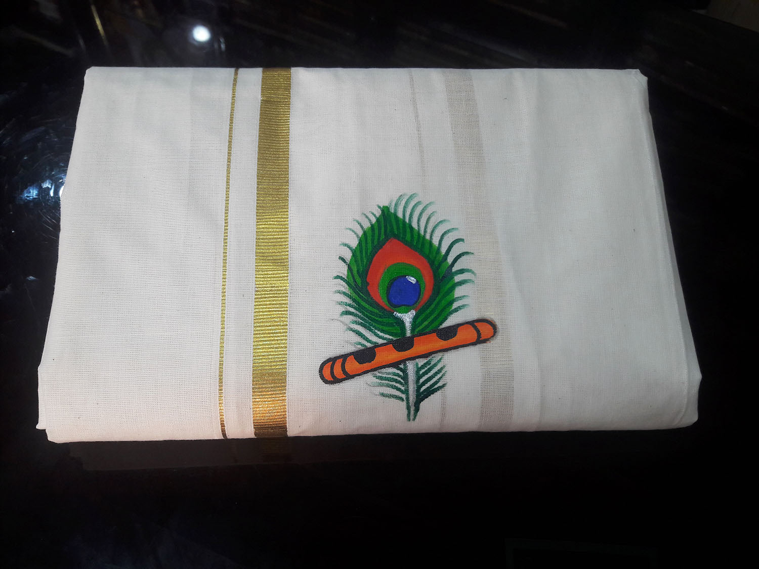 This 4-meter mazhilpeeli mundu is hand-painted with an intricate flute mural and is perfect for traditional occasions. The lightweight and airy fabric makes this garment a pleasure to wear and allows your skin to breathe. The perfect blend of artistry and comfort. Trivandum top mazhilpeeli hand mural painting online shopping site.